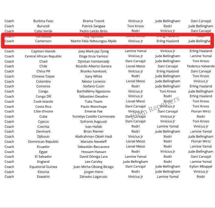 Parmi les nombreux suffrages exprimés, celui du Cameroun n’est pas passé inaperçu. Martin Ndtoungou Mpile, entraîneur adjoint des Lions Indomptables, a placé Vinicius en tête de son classement, suivi d’Erling Haaland et de Jude Bellingham. Un choix qui reflète une vision pragmatique et bien ancrée dans les performances actuelles du football mondial.