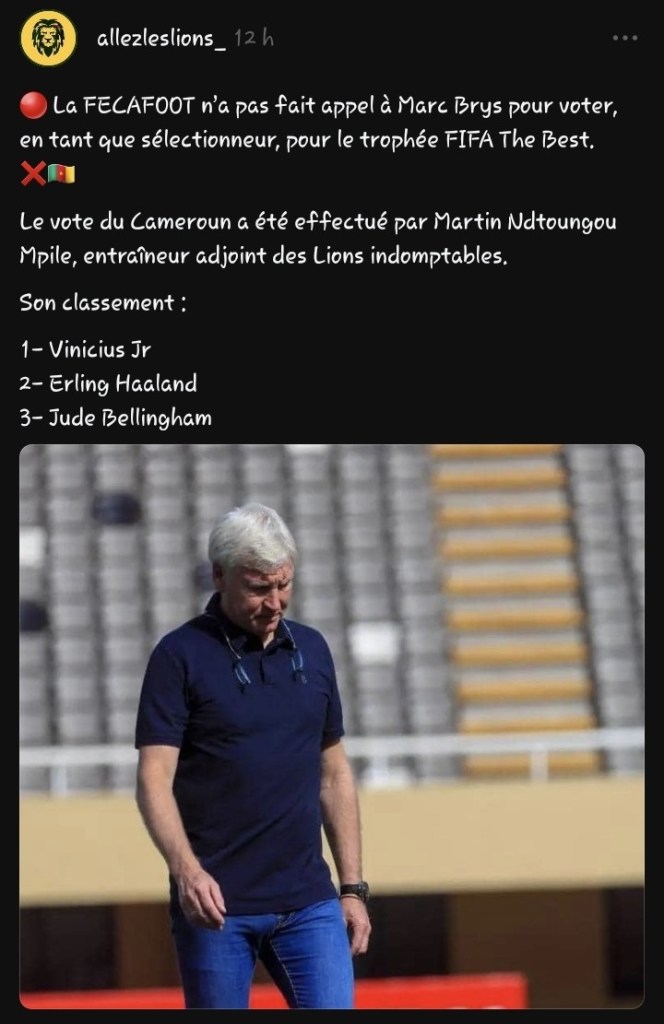 Le vote camerounais a toutefois suscité des interrogations. En effet, selon les règles établies par la FIFA, c’est généralement le sélectionneur principal qui est appelé à voter pour le trophée The Best. Or, cette année, Marc Brys, le technicien belge à la tête des Lions Indomptables, n’a pas pris part au processus, laissant cette tâche à son adjoint.