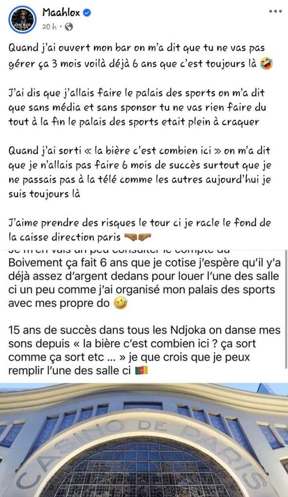 Paris va trembler au rythme du ndjoka. Et Maalhox le sait mieux que personne : le bruit, il ne le subit pas, il le fabrique. Tandis que le clash contre Ko-Cee agite la toile camerounaise et francophone depuis plusieurs jours, l’auteur de « Tu montes tu descends » frappe un grand coup. Ce 24 mai au soir, via une publication aussi piquante qu’arrogante, Maalhox a décidé de capitaliser l’énergie fourni pas l’affrontement… il a officialisé la tenue d’un concert exclusif à Paris pour 2025.