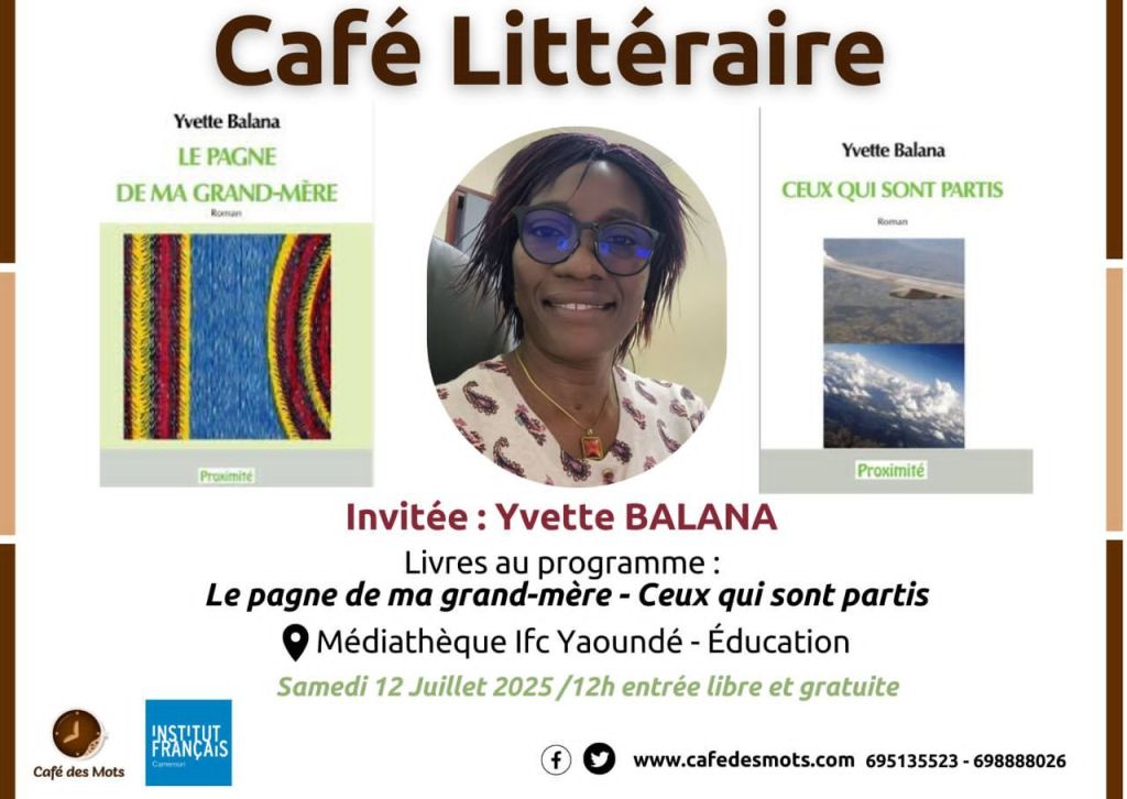 L’Association Camerounaise pour la Promotion Littéraire, Le Café des Mots, vous invite chaleureusement à une rencontre d’exception autour des œuvres percutantes de l’auteure Yvette BALANA, le samedi 12 juillet 2025 à 12h, à la Médiathèque de l’Institut Français du Cameroun (IFC), située au lieu-dit Éducation.